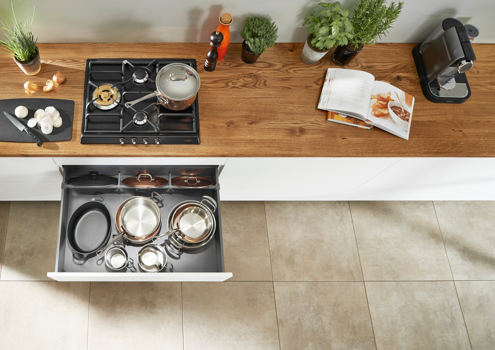 El AMBIA‑LINE de Blum ofrece marcos y perfiles intercambiables para cajones LEGRABOX y MERIVOBOX en alturas de sistema M y K, manteniendo la estética depurada de la serie. Incluye marcos de acero con recubrimiento epóxico, bandejas SoftTouch y un perfil de corte ajustable acompañado de separadores longitudinales que se enganchan sin herramientas.