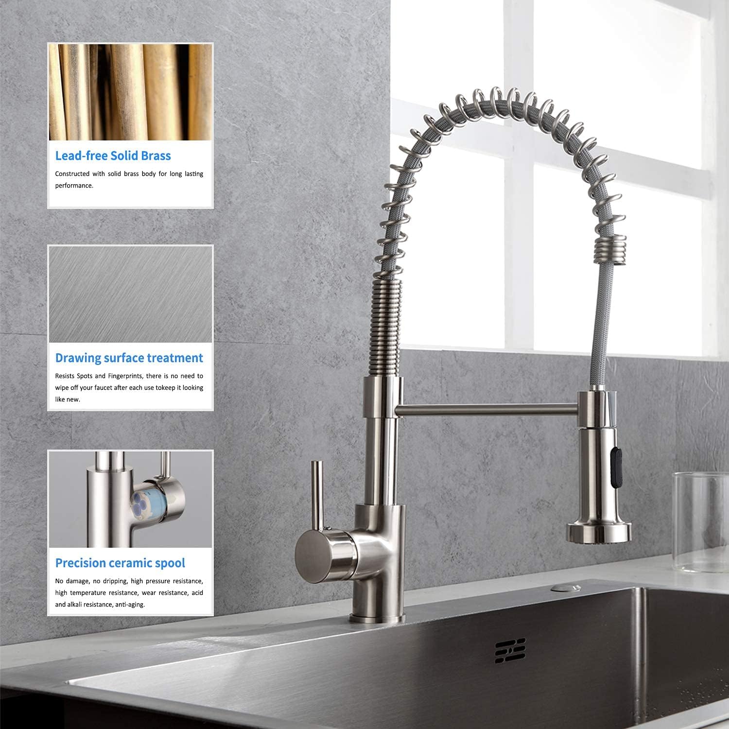 - Grifo de primera calidad – Mezclador monomando de latón macizo y sin plomo con superficie de níquel cepillado, resiste la corrosión y el deslustre, protege contra huellas dactilares y manchas de agua, constituyó la piedra angular para una larga vida útil.